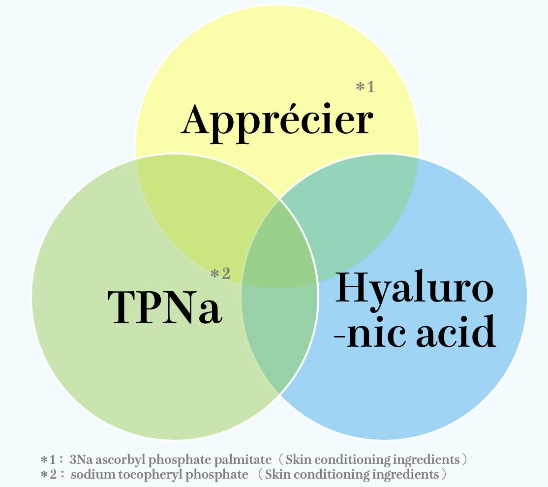 Water, Glycerin, Pentylene glycol, Sodium tocopheryl phosphate (TPNa), Trisodium ascorbyl palmitate phosphate (APPS), Sodium hyaluronate, Citric acid, Phenoxyethanol